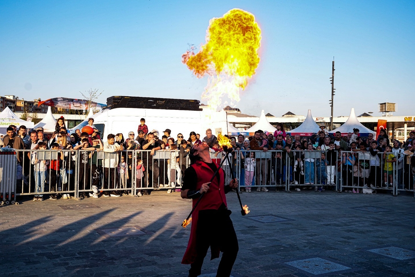 Çocuklar “Ateş Gösterisi”ni izlemek üzere kendilerine ayrılan bölümde yerlerini alırken aileleri de onlara eşlik etti. Şov, dansçıların iplerin ucuna asılı ateş toplarını çevirmesiyle başladı. Ateş toplarını havada uçuran dansçılar performansları ile seyircilerin alkışlarını aldı. Ateşbazlar ise heyecanı daha da arttırdı. Çocuklar; ağzından ateş çıkan dansçıları büyük ilgi ile takip etti.